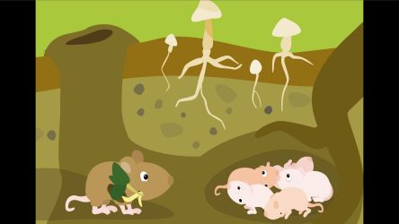Squirrels, woodpeckers, bark beetles and bees live in this biome. Rabbits and mice have their underground tunnels and their young hide in shelters in their homes. A vulture chases a mouse and feeds its young - freshly hatched from their eggs. Even snakes soon have eyes for baby mice. A bear tries to catch fish from the river while a hedgehog drags a rain worm. A bud sprouts from an acorn and mushrooms emerge from the ground. Click on the clouds and the rain begins to pour down.