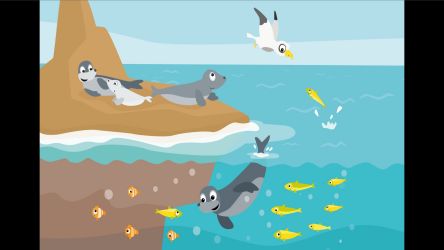 Fish, seahorses, jellyfish, octopus, sea urchins, mollusks and large, voracious sharks inhabit this busy biotope. Seagulls and seals grab a fish. A fish swallows a snail. Turtles lay eggs in the sand and crabs have little squabbles. A seal family sunbathes on an island and plays in the sea. Patting the sun and watching the water evaporate to form little clouds.