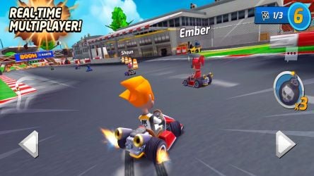 Enter the world of Boom Karts and play online against friends and players from all over the world! Drive and race on various tracks in this arcade karting game. The races are in real time, so you're always right in the middle of the crazy action!